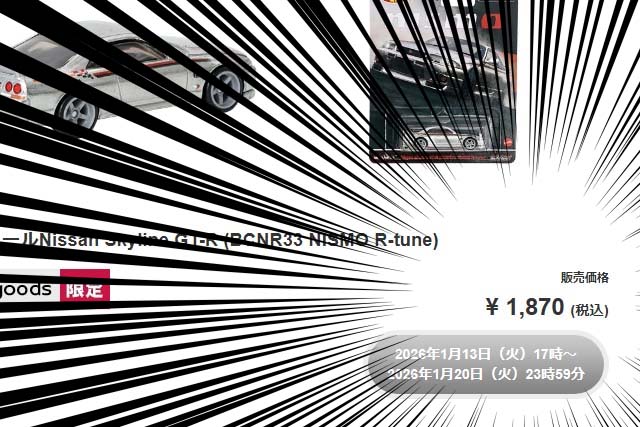[参考]日産オンラインショップ:ホットウィール Nissan Skyline GT-R (BCNR33 NISMO R-tune) 抽選販売